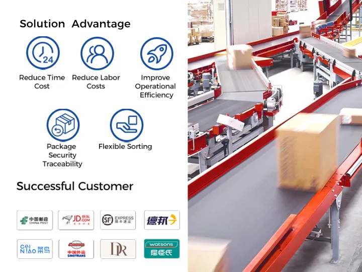 Solution advantage:Reduce time cost、Reduce labo costs、Improve operational efficiency、Package security traceability、Flexible sorting